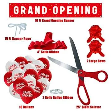 For extra flair, you'll receive two large red bows that can embellish the grand opening ribbon, adding a charming touch to your setup. The kit also includes an impressive selection of 16 balloons (8 red and 8 white), 2 rolls of balloon ribbon, and a 19-foot rope for hanging the banner, ensuring that you have the ideal quantity to decorate your opening party exactly as you desire.