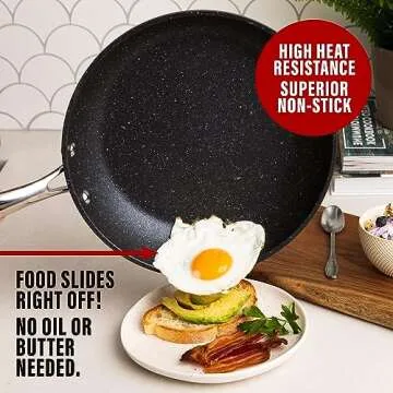 Show moreIntroducing the Granitestone 11" Non-Stick Frying Pan, your ultimate kitchen companion for effortless and healthy cooking. Designed with a cutting-edge mineral-based nonstick coating infused with titanium and diamond particles, this pan guarantees seamless cooking experiences and makes meal prep a breeze. Perfectly suited for stir-frying, searing meats, or cooking breakfast favorites like eggs, the Granitestone frying pan makes cooking enjoyable and hassle-free. With an oven-safe temperature of up to 500°F, this versatile skillet can transition effortlessly from stovetop to oven. Cleanup has never been easier—simply wipe it down or toss it in the dishwasher for a quick refresh, leaving you more time to enjoy your culinary creations.