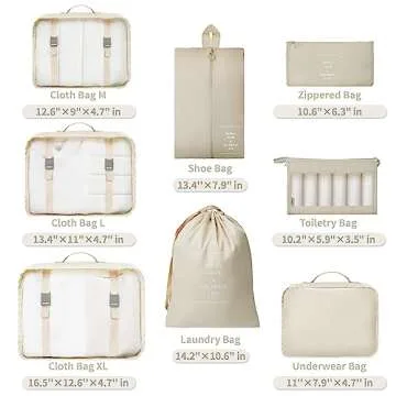 Show more Introducing the ultimate travel companion - our 8-Piece Multifunctional Packing Cube Set. Made from high-quality nylon and soft mesh, this versatile storage solution is designed to enhance your travel experience by keeping you organized and stress-free. The set includes various bags tailored for specific travel needs: a large interior volume for clothing, a shoe bag, a laundry bag, and more. Say goodbye to the chaos of packing and embrace the convenience of having your essentials sorted and easily accessible.