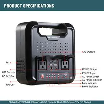 Show moreIntroducing the GrantMaya Portable Power Station, your ultimate solution for portable power needs. This high-performance power generator is equipped with a robust 220Wh/64,800mAh lithium battery and an impressive 300W pure sine wave AC output. Whether you're camping in the great outdoors, fishing by the lake, or in need of reliable backup power at home, this power station delivers versatility and efficiency, ensuring that your devices stay charged no matter where you are. Capability is enhanced by four USB outputs (5V/3.1A Max) ideal for smartphones, tablets, and more, and a dedicated 12V/10A DC output designed for electric tools or car accessories.