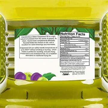 Show moreIntroducing the Grape Seed Oil, 3 Liter by Unpretentious Baker – a culinary delight that is as versatile as it is nourishing. This 100% pure grape seed oil is derived from the seeds of the Vitis vinifera grape, making it a fantastic addition to any kitchen. With its light, odorless profile, this oil perfectly enhances flavors without overpowering your dishes. Whether you're cooking, baking, or frying, this oil is your go-to choice for a variety of recipes. What sets it apart is its commitment to quality: it’s vegan, gluten-free, and non-GMO, ensuring that you’re using the healthiest ingredients in your meals.