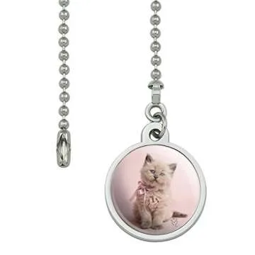 Show moreElevate your home decor with the stunning GRAPHICS & MORE Miradoll Ragdoll Cat Kitten Pink Ribbon Bow Ceiling Fan and Light Pull Chain, a charming accessory that brings personality to your ceiling fan or light fixture. This delightful pull chain features a beautiful resin-topped design showcasing a cute ragdoll kitten adorned with a pink ribbon bow, making it a must-have for cat lovers who want to add a touch of whimsy to their living space. Measuring approximately 1.0" (2.5cm) in diameter, the intricate design is not just visually appealing; it’s also crafted with care, ensuring durability and longevity. The included 8" (20.3cm) ball chain can be easily adjusted to your desired length, allowing for a perfect fit in any room.