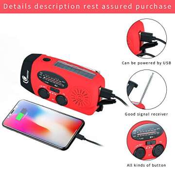 Show moreIntroducing the GREATONE Emergency Hand Crank Self Powered AM/FM NOAA Solar Weather Radio, your ultimate companion for unpredictable weather and emergency situations. This robust device is designed to keep you informed and connected, featuring a powerful 1000mAh power bank capable of charging your smartphone. It boasts AM/FM and NOAA weather band radio capabilities, ensuring that you're always tuned into vital emergency alerts. Complete with a built-in LED flashlight, this functional device not only keeps you entertained but also provides safety and security when you need it the most. Crafted in a stylish oxblood red finish, the GREATONE radio combines durability with an attractive design, making it an essential addition to any emergency toolkit.
