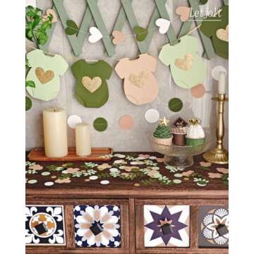 Transform your baby shower or gender reveal party into a vibrant celebration with the exquisite Green Brown Baby Shower Paper Garland. This delightful garland is composed of premium cardstock adorned with shimmering glitter hearts that instantly captures attention. Measuring approximately 5.5’’ wide and 6.3’’ long, each short-sleeve bodysuit in this charming collection adds a touch of whimsy to your event. The entire garland spans an impressive 8 feet...