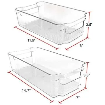 These versatile storage bins can be utilized for a multitude of purposes, from organizing fruits and vegetables in the fridge to storing craft supplies in your workspace. Measuring in varying sizes, including four wide bins (7" L x 14" W x 4" H) and four smaller bins (6" L x 12" W x 4" H), you can create a customized storage system that suits your needs perfectly. With easy-grip handles for effortless transportation and a clear body for visible contents, you won’t ever misplace or forget where you stored your favorite items again!