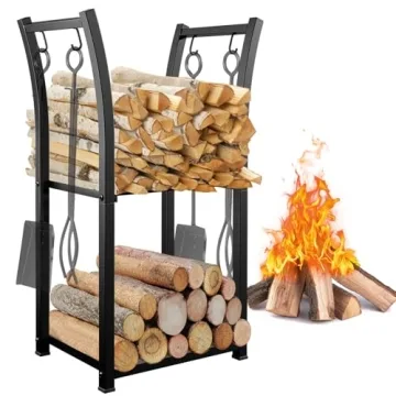 GREENER 2 Tiers Indoor Firewood Rack with 4 Hooks - Portable Outdoor Firewood Rack, Heavy Duty Log Rack Wood Holder, Sturdy Firewood Storage Stand for Fireplace, Patio, Fire Pit, Stove - Black