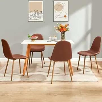 Show moreTransform your dining experience with the GreenForest Dining Chairs Set of 4. These exquisite chairs showcase a seamless blend of functionality and style, featuring sumptuous camel brown PU leather upholstery that exudes luxury while offering the practicality of easy cleaning. Crafted with a high-quality waterproof covering, these chairs effectively resist dirt and stains, ensuring minimal maintenance after meals. With a sleek mid-century modern design highlighted by a curved backrest, these chairs not only provide comfort but also elevate the aesthetic of any space, making them an ideal choice for your dining room, kitchen, or living area.