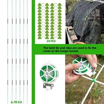 Show more Introducing the Greenhouse Hoops Planting Tunnel 6X6.7ft from ACCESSPORIES, a versatile solution for your gardening needs. This planting tunnel is designed to cover widths of about 2.5ft to 5ft, making it an ideal fit for various sized garden beds or plots. Constructed from high-quality fiberglass, the support hoops offer not only flexibility but also exceptional resistance to corrosion and rust. This ensures a durable shelter for your plants against harsh weather conditions, whether you're gardening indoors or outdoors. Each set comes equipped with 24 net clips and a handy twist tie, providing secure fastenings that keep your cover firmly in place, allowing you to plant without fears of changing weather.