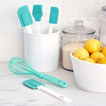 Show moreIntroducing the GreenLife Cooking Tools and Utensils Set, a meticulously crafted 5-piece baking ensemble designed for both novice bakers and seasoned chefs alike. This vibrant turquoise set includes three nylon spatulas (small, medium, and large), a durable nylon whisk, and a silicone brush featuring an ergonomic nylon handle. Each utensil in this collection is crafted to withstand high temperatures, making them ideal for a variety of baking and cooking tasks, as they can resist heat of up to 400°F. The stunning color not only brings a stylish touch to your kitchen but also makes cooking a joyful experience!