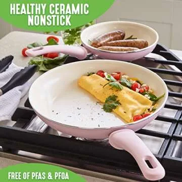 Show more Introducing the GreenLife Soft Grip Healthy Ceramic Nonstick Frying Pan Skillet Set, your new companion in the kitchen! This stunning set, available in charming soft pink, includes three versatile sizes: 8 inches, 10 inches, and 12 inches. Crafted with a healthy ceramic nonstick coating derived from sand, these skillets promise both effortless food release and quick cleanup, making them perfect for busy home cooks and culinary enthusiasts alike. The toxin-free design ensures peace of mind with every meal, as they are free from harmful chemicals such as PFAS, PFOA, lead, and cadmium. With the soft grip Bakelite handles that are designed to stay cool, you can enjoy maximum comfort while cooking at lower heat for optimized results.