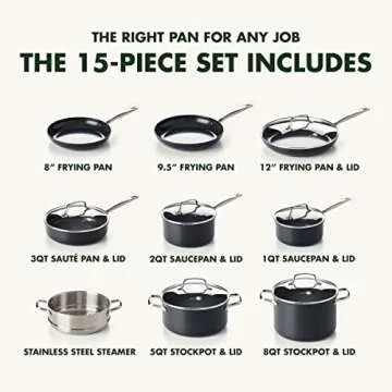 ... Show more Introducing the ultimate culinary companion, a premium cookware set designed to elevate your cooking experience to new heights. This exquisite collection includes a variety of pots and pans, such as a 1-quart and 2-quart saucepan complete with lids, a 5-quart stockpot, and multiple frying pans including an impressive 12'' frypan with lid. Crafted by GreenPan, renowned for its commitment to quality and health-conscious cooking, this cookware is more than just a kitchen essential; it’s a lifestyle upgrade.