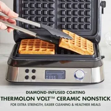 Show more Indulge in the delightful world of homemade waffles with the GreenPan Stainless Steel 2-Square Waffle Maker Iron. This innovative appliance combines style and functionality, featuring a revolutionary healthy ceramic nonstick coating that is crafted with Thermolon Volt technology. Not only does this diamond-infused ceramic keep your waffles from sticking, but it also withstands the rigors of daily use without compromising your health, ensuring that your meals are free from harmful toxins like PFAS, PFOA, lead, or cadmium. With its elegant stainless steel design, this waffle maker not only performs exceptionally but also looks great on your kitchen counter.