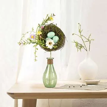 GREENSTORE 2PCS Easter Simulation Bird Nest with Eggs, Handmade Rattan Bird Nest with Flowers and Eggs, Easter Wreath Decorative Birds Nest for Front Door Wall Home Decor Party