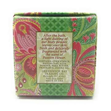 Show moreElevate your self-care routine with the luxurious Greenwich Bay Trading Co. Dusting Powder. Infused with enchanting Passion Flower and nourishing Olive Oil, this lightweight body powder is designed for after-bath indulgence. Housed in an elegant gift box, this dusting powder features a subtle yet invigorating botanical scent that refreshes your skin while absorbing moisture, leaving you feeling silky smooth and delicately scented. The included soft powder puff makes application easy and enjoyable, ensuring a delightful spa-like experience in the comfort of your own home. With a net weight of 4 oz, this powder is perfectly sized to last you through many relaxing baths.