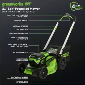 Greenworks 60V 21” Cordless (Self-Propelled) Lawn Mower (LED Lights + Aluminum Handles), 2 x 4.0Ah Batteries and Dual Port Rapid Charger