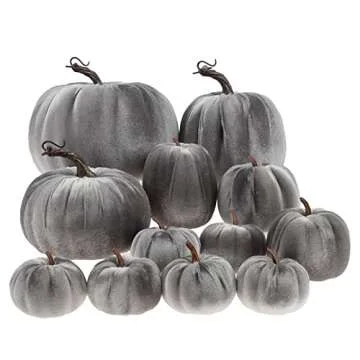 Show moreTransform your seasonal decor with the exquisite Gresorth 12pcs Large Artificial Velvet Fall Harvest Pumpkins. Perfectly crafted for those who appreciate both elegance and charm, these handmade velvet pumpkins come in a gorgeous palette of colors, including a stunning grey shade that fits seamlessly into any autumnal theme. Each piece is made from high-quality foam, skillfully wrapped in a soft, luxurious velvet fabric that lends a sophisticated touch to your home decor. The set includes a variety of sizes to give you the utmost versatility in decorating your space, whether it's for Halloween, Thanksgiving, or a cozy gathering.