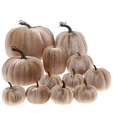 Show moreIntroducing the Gresorth 12pcs Large Artificial Velvet Pumpkins set, designed to elevate your fall décor elegantly. Crafted with meticulous attention to detail, each pumpkin features a soft velvet exterior, giving it a luxurious feel while adding warmth to your home. This stunning collection includes an assortment of sizes—ranging from a prominent 7.1-inch piece to charming little 3-inch pumpkins—making it versatile enough to fit any display or centerpiece needs, whether it be for Halloween, Thanksgiving, or any festive celebration. The vibrant champagne color enhances its visual appeal, providing a chic accent that complements various color palettes in your home.