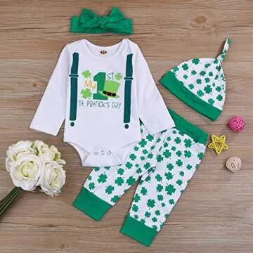GRNSHTS Newborn Baby Boy My First St.Patrick's Day Outfits Green Romper Four-Leaf Clover Pants Hat Headband Clothes Set (White, 3-6 Months)