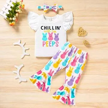 GRNSHTS Toddler Baby Girl Easter Outfits Short Sleeve Bunny Print Shirt Tops+Flared Pants+Headband 3PCS Clothes Set (White, 2-3 T)