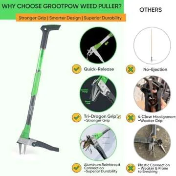 When comparing the Grootpow WP5 to other weeders on the market, it stands out in both functionality and design. While many competitors lack the advanced 3-claw gripping mechanism, the Tri-Dragon design ensures complete root removal without causing any damage. Additionally, the ergonomic 40" standing length is superior compared to traditional weeding tools that require bending, allowing for less strain and more comfort during use. Many alternatives also lack the lifetime service promise, showcasing Grootpow's commitment to customer satisfaction and product reliability.