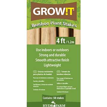 Show moreIntroducing the GROW!T HGBB4 Hydrofarm HGBB450 4' Natural Bamboo Stake—the ultimate solution for your gardening and plant support needs. This remarkable product comes in a generous pack of 50, ensuring you have ample supply to support all your plants, whether vegetable, flower, or ornamental. Made from high-quality, natural bamboo, these sturdy stakes not only add a natural aesthetic to your garden or indoor plant display but are also remarkably strong, flexible, and lightweight. At 4 feet in height, they are perfect for a myriad of plant types, offering reliable support as your plants grow tall and robust.