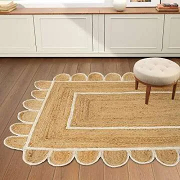 GRUHUM Scalloped Jute Rugs 2'x3' ft Natural White Trim Rectangular Handmade Boho Farmhouse Soft Braided Rustic Vintage EcoFriendly Rug Living Room Bed Room Kitchen Hallways Enterways 2x3ft (Doormat)