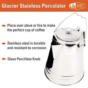 GSI Outdoors Percolator Coffee Pot I Glacier Stainless Steel Ultra-Rugged for Brewing Coffee Over Stove and Fire | Ideal for Group Camping, 8 Cup