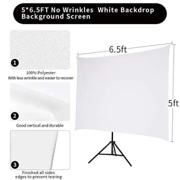Show more Introducing the GSKAIWEN 5x6.5ft White Backdrop with Stand, a perfect solution for all your photography needs! This premium backdrop features high-quality polyester that is not only wrinkle-resistant but also non-reflective, ensuring that you capture stunning images every time. Weighing in at an impressive 11.29oz/320g per square, the fabric drapes beautifully, creating a superb vertical effect without any unsightly creases. With edges properly hemmed and finished, fraying and tears are a thing of the past. Plus, it’s machine washable, ironable, and foldable, providing versatility and ease of use for repeated sessions.