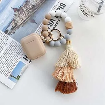 Gtinna Fashion Cute Stripe for Apple AirPods 1&2 Case,Silicone Case for AirPods Wireless Charging Case with Silicone Beaded Bracelet Colorful Tassel Charm Keychain Accessories (Khaki)