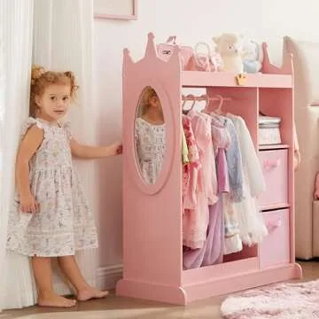 GTOLV Kids Dress up Storage with Mirror, 2 Storage Bins & Cloth Hanger, Kids Play Armoire Dresser Pretend Storage Closet for Bedroom, Kids Room, Playroom (Pink)
