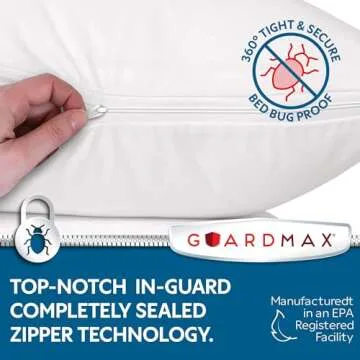 Show more Your search for the perfect pillow protector ends here with the Guardmax 100% Waterproof Pillow Protector! Designed meticulously to ensure every sleep is peaceful and worry-free, these pillow covers offer unmatched protection against perspiration, drooling, and all liquid spills, safeguarding your precious pillows and extending their lifespan. With a patented zipper enclosure featuring Guardmax Patented Technology, you can say goodbye to those pesky bed bugs that threaten to invade your bedtime sanctuary. Hypoallergenic in nature, this pillowcase shields your skin from dust mites and allergens that might cause discomfort, ensuring a comfortable night sleep for everyone.