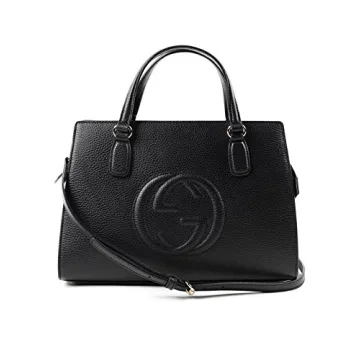 Show moreElevate your style with the Gucci Soho Leather Satchel Tote, a stunning addition to any fashionable wardrobe. This structured shoulder bag is meticulously crafted in exquisite black calfskin leather, featuring an embossed interlocking GG logo that pays homage to Gucci's iconic heritage. With its luxurious gold-tone hardware and elegant zip closure, this tote not only stands as a statement piece but also offers practicality and organization. The interior is thoughtfully designed with one zipper pocket and an additional card slot, ensuring you have all your essentials in one chic location.