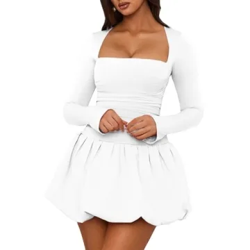 GUCURIN Women Bubble Mini Dress Long Sleeve Square Neck Backless Puffy Skirt Dress Short Formal Dresses(S,White)