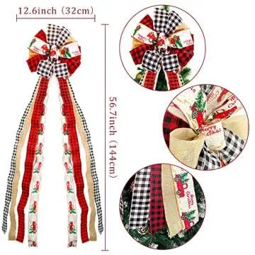Show moreTransform your Christmas tree into a stunning focal point with the GUDELAK Christmas Tree Topper Bow. Measuring an impressive 57 x 13 inches, this beautifully crafted bow blends rustic charm with festive flair, making it the perfect addition to your holiday decor. Made from premium burlap and featuring delightful four classic styles of ribbons including buffalo plaid and a charming red truck design, this tree topper brings a touch of nostalgia and warmth to your celebrations.