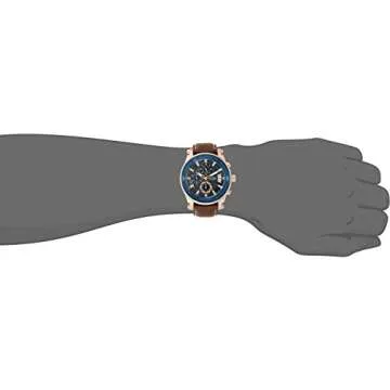 Show moreIntroducing the magnificently crafted GUESS Brown + Blue Genuine Leather Chronograph Watch with Date Function, a timepiece that embodies elegance and functionality in one striking design. This watch features a captivating blue chronograph dial that contrasts beautifully with the polished rose gold-tone case, making it an eye-catching accessory for any occasion. With a remarkable 46mm case size, it sits comfortably on the wrist while exuding a bold presence that is bound to draw admiration.