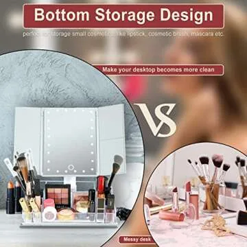 GULAURI Makeup Mirror with Lights and Storage - 3x/2x Magnification, Tri-Fold Cosmetic Vanity Mirror with 24 Led Light, Touch Screen, 180 Degree Adjustable Rotation