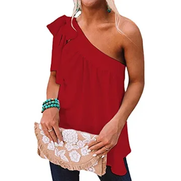 Guteidee Women's One Shoulder Tops Casual Tie Bow Knot Sleeveless Blouse Tunic Shirts Dark/Red X-Large