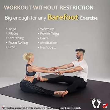 Show more If you're looking for the perfect workout companion, look no further than this oversized fitness mat, designed to give you the freedom to exercise without any restrictions. With its extra-long and wide dimensions, it allows you plenty of room to practice all your favorite workouts, whether they involve yoga, pilates, stretching, or light cardio. This product is perfect for any home gym setup and ensures you never have to worry about feeling cramped or constrained during your routine.