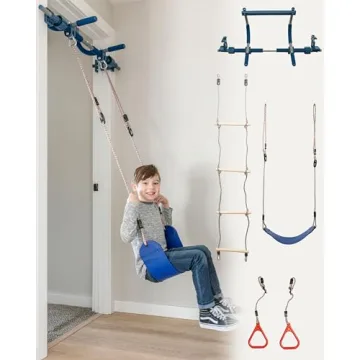 Show moreIntroducing the Gym1 4-Piece Doorway Swing Set, the ultimate indoor playground designed for families seeking fun, fitness, and adventure all in one place! Perfect for kids of all ages, this versatile set includes a swing, grip gymnastic rings, an agility ladder, and a sturdy pull-up bar, transforming everyday spaces into exciting play zones. Built to support up to an impressive 300 lbs, it’s perfect for children to enjoy countless hours of active play, while parents can also benefit from its robust design for effective workouts. It fits most door frames with ease, allowing you to easily create a fitness and fun hub.
