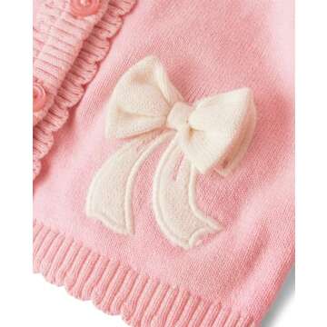 What makes this cardigan stand out are its unique features: a button front that makes dressing up a breeze and a beautiful scalloped tulle trim that adds a feminine flair. The sweet embroidered bows add extra charm, making this cardigan not just clothing, but a stylish statement piece for your baby girl.