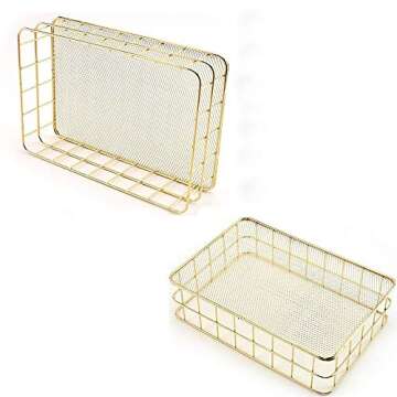 Show moreIntroducing the GYY Gold Desktop Metal Storage Basket—a stylish and functional piece designed to elevate your home organization while enhancing your interior decor. Made from durable iron wire, this large storage tray not only provides a generous space for your essentials but also adds a touch of elegance with its golden finish. The unique hollow grid design allows for easy viewing and access to your items, making it an ideal solution for storing cosmetics, jewelry, snacks, and more. With its sturdy build, you can confidently pack it with your favorite items without worrying about stability.