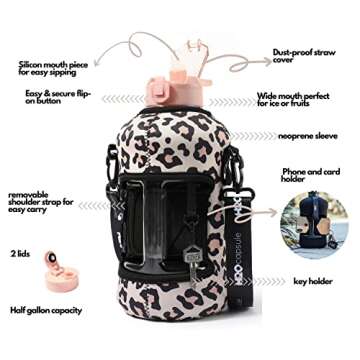 What sets the H2O Capsule apart is its unique removable thermal storage sleeve. This thoughtful feature utilizes the space under the jug handle creatively to store essentials securely. Plus, the sleeve comes complete with an in-built keychain and a removable shoulder strap, allowing for hands-free convenience while you exercise. Being the only encased water jug that caters to your storage needs, it elegantly combines functionality with style, available in multiple eye-catching colors and designs, including a trendy Leopard Print.