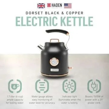Show more Upgrade Your Morning with the stunning Dorset Electric Kettle by Haden – an exquisite fusion of classic style and modern engineering that gracefully elevates any kitchen space. Crafted with a focus on cleanliness, quality, and performance, this kettle showcases a user-friendly, minimalist design that celebrates simplicity while offering functional excellence. With a generous 1.7-liter capacity, perfect for boiling your favorite teas or preparing instant meals, the Dorset kettle ensures a steady supply of hot water right at your fingertips.