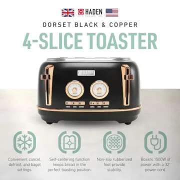 Show moreUpgrade your mornings in style with the Dorset toaster from Haden, where classic elegance meets modern functionality. This toaster doesn't just make toast; it transforms your kitchen space into a contemporary culinary haven. With its sleek design and superior performance, it becomes an essential centerpiece in any kitchen décor. The Dorset toaster features four wide slots, perfect for accommodating everything from bagels to thick slices of artisanal bread. It employs a self-centering function that guarantees even toasting, making breakfast a delight rather than a chore.