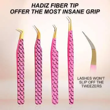 HADIZ Fiber Tip Tweezers Set of 4 Diamond Grip Eyelash Extensions Tweezers Japanese Stainless steel Lash Tweezer (Pink)