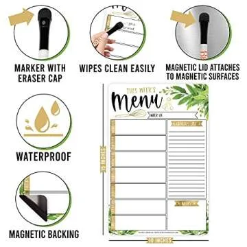 Included with your meal planner is a handy 6x8 kitchen measurement conversion chart and a dry-erase marker, making it simpler than ever to whip up dinner. The vibrant green and gold color scheme adds an attractive touch to your kitchen decor, inspiring creative meal ideas while enhancing organization.