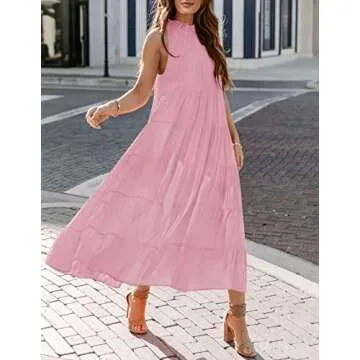 Show moreIntroducing the stunning HAEOF Women’s 2025 Summer Casual Sleeveless Halter Maxi Dress, the culmination of comfort and elegance. Crafted from soft, breathable rayon fabric and designed with a full lining, this dress ensures both coverage and style. The halterneck design pairs beautifully with the self-tie back strap, providing a flattering silhouette for various body shapes. Its pleated tiered swing design adds an effortlessly chic touch, making it your go-to choice for any event!