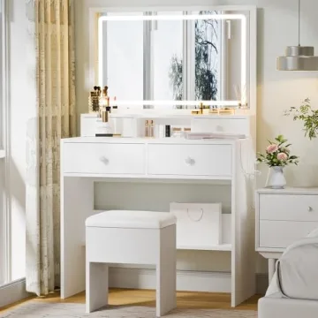Haewon Makeup Vanity Desk with Mirror and Lights, Vanity Table with 4 Drawers, Charing Station and Storage Chair