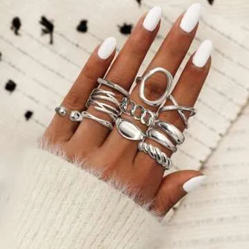 Show more Explore the stunning Gold Rings Set, a unique collection offering endless style options. This set comes with 16 pieces encompassing chunky dome rings, statement rings, braided twisted rings, signet rings, geometric rings, and chain rings. Each ring is designed to provide you with versatility, allowing you to stack them creatively or wear them separately for varied looks.