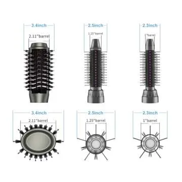 Show more Introducing the ultimate hair styling solution that combines convenience, versatility, and salon-quality results right at home. This remarkable hair brush dryer boasts three distinct brush sizes, perfect for any length or type of hair. The largest 3.4-inch oval brush creates stunning volume and shine while effectively straightening your locks, making it ideal for mid to long hair. The medium-sized 2.5-inch round brush and the small 2.3-inch round brush offer the flexibility to refine your style or reach those layered locks effortlessly.